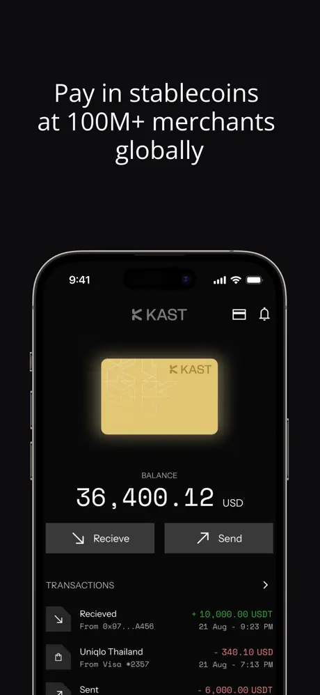 - Pay with your stablecoins via your KAST Card at over 50 million merchants globally.